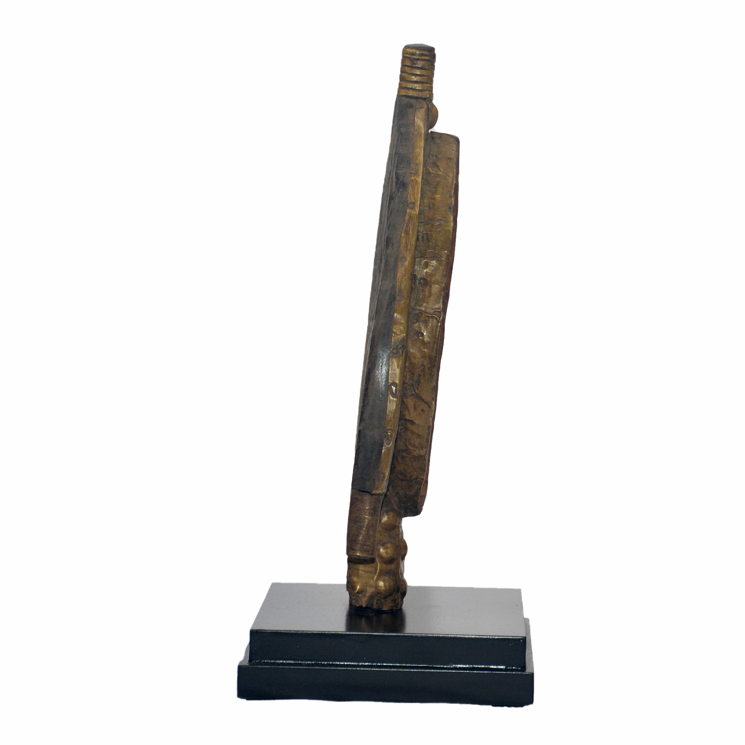 The statue is mounted on a black medium-density fiberboard base, giving it a modern touch.